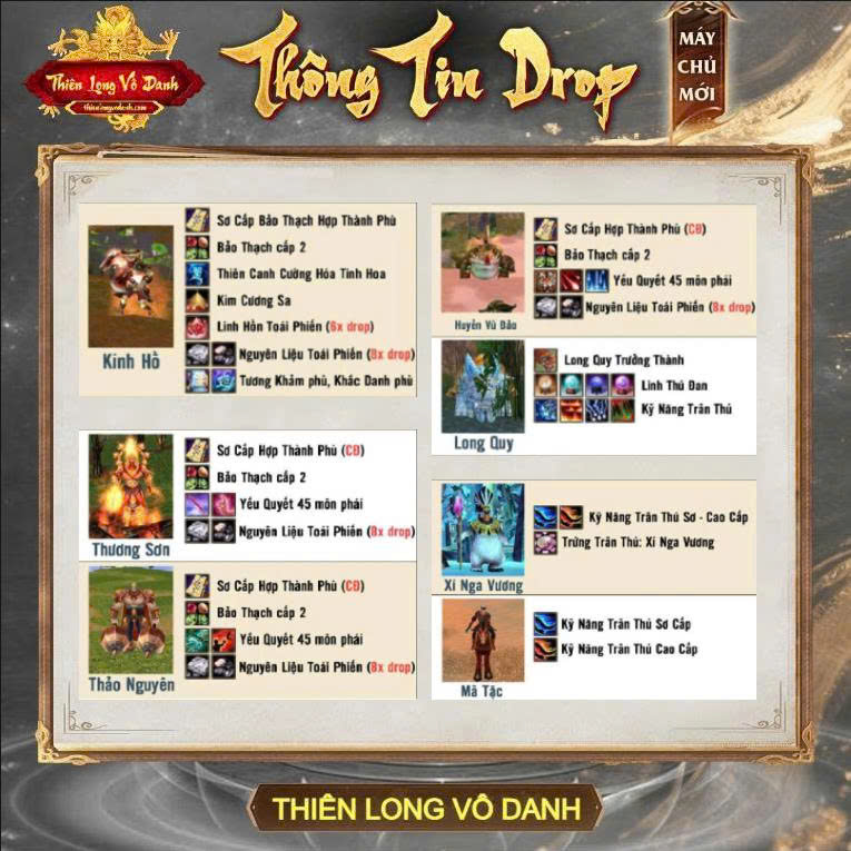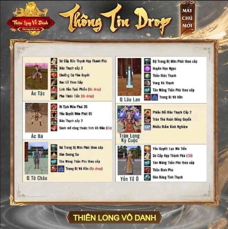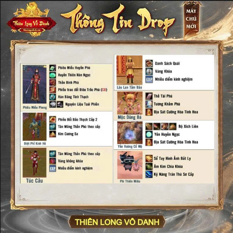 Máy chủ Vô Danh Thần Tăng sắp ra mắt tới cộng đồng game thủ. Cùng Thiên Long Vô Danh xem thông tin Drop Boss và Phụ Bản giai đoạn cấp độ 89 nào